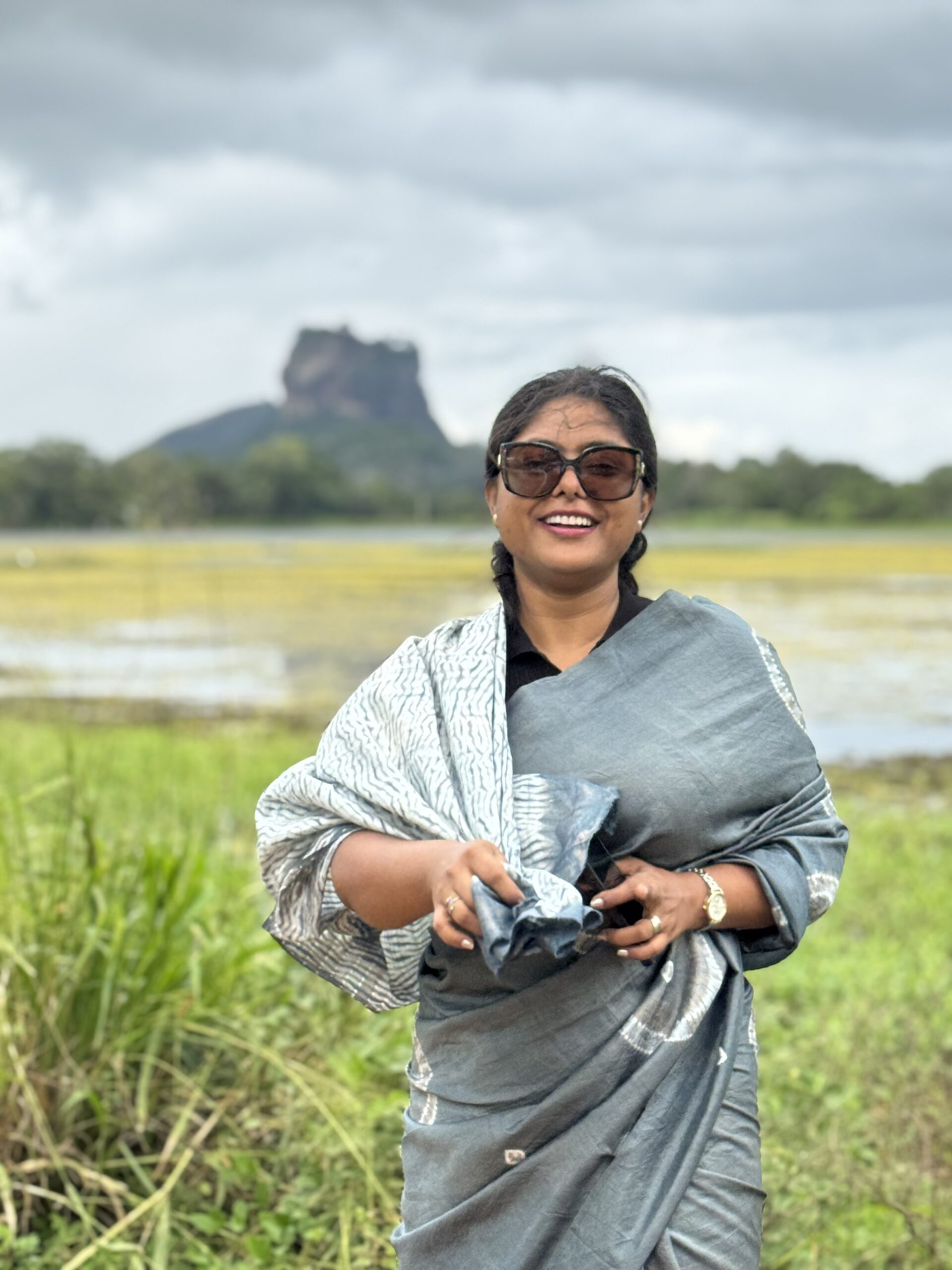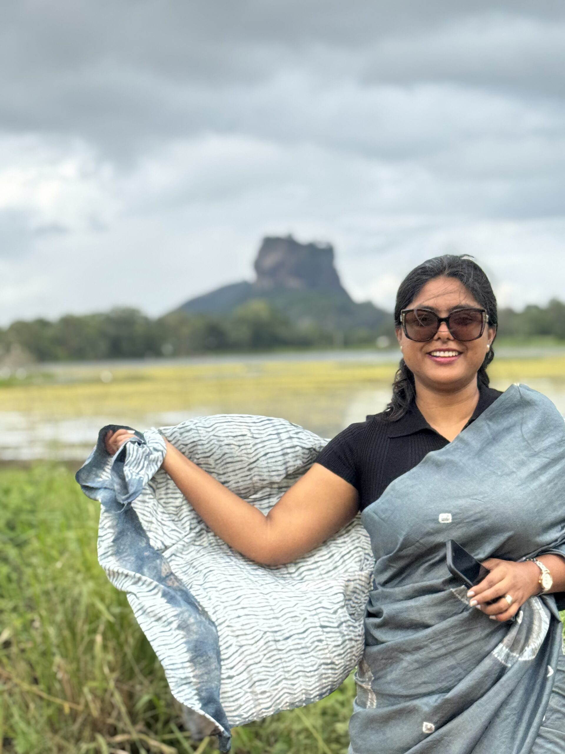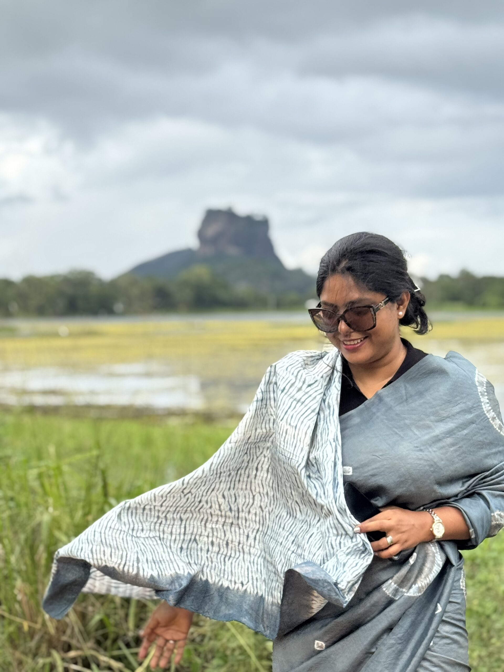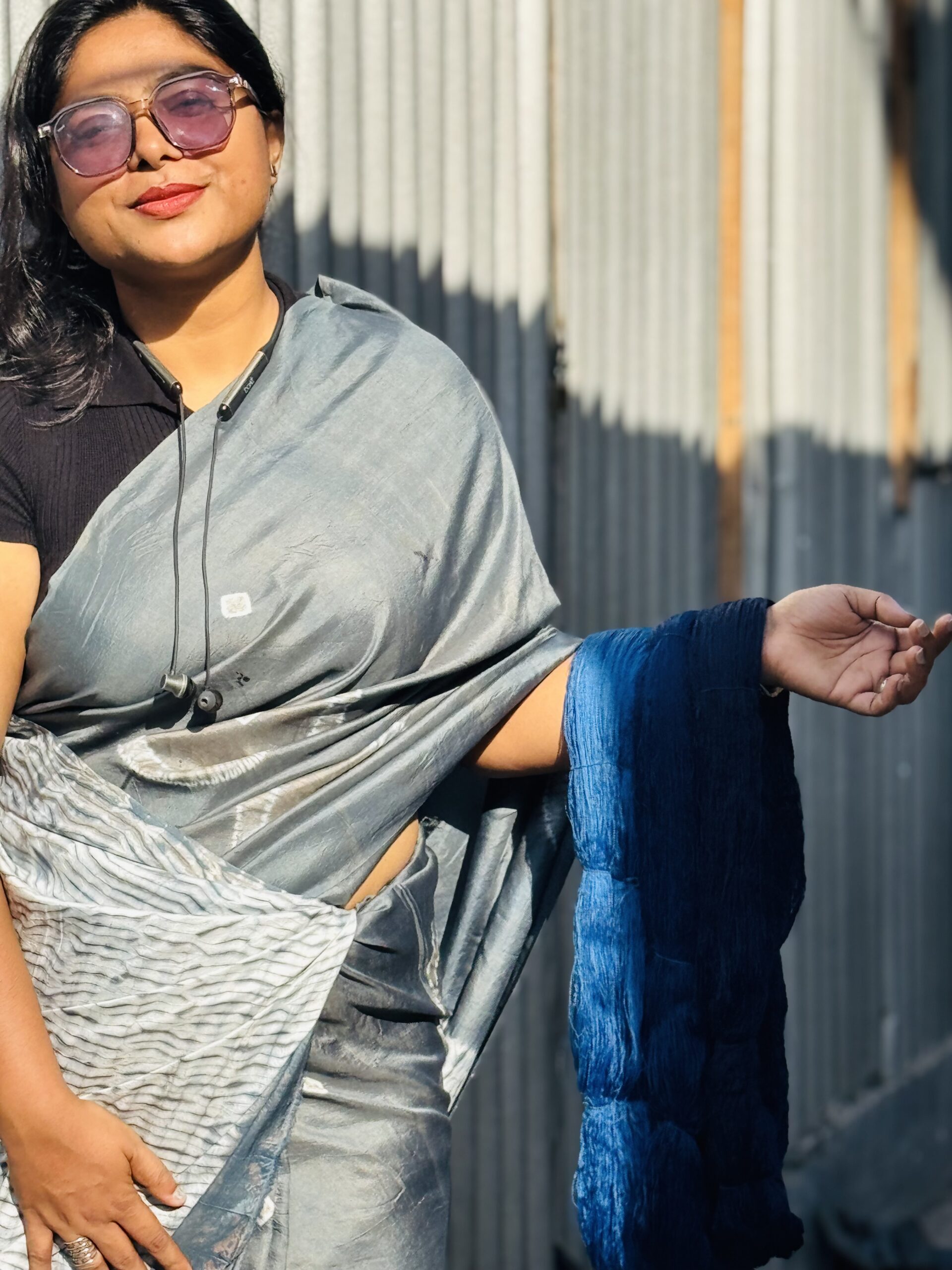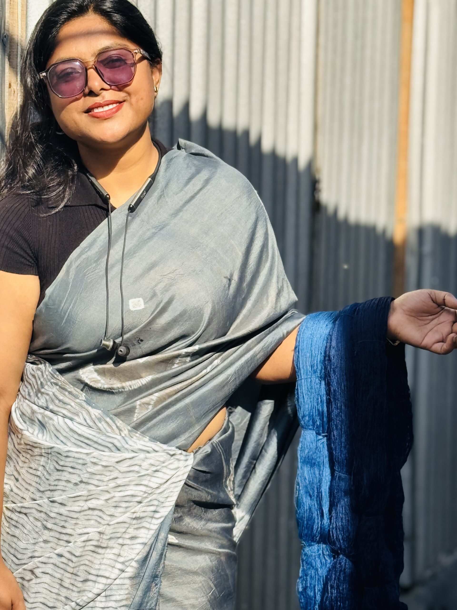 The oxidized metallic tone brings a smoky elegance, while the hand-done Shibori work adds a textured, organic rhythm across the fabric. Each fold tells a story of artisan touch and mindful making. This saree includes a matching blouse piece, making it a complete ensemble for any occasion that calls for timeless sophistication.